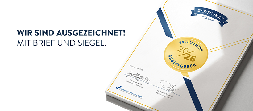 Für unser Engagement rund um unsere Mitarbeiter:innen sind wir vom Steuerberaterverband e.V. Köln mit dem Qualitätssiegel „Exzellenter Arbeitgeber“ ausgezeichnet worden.